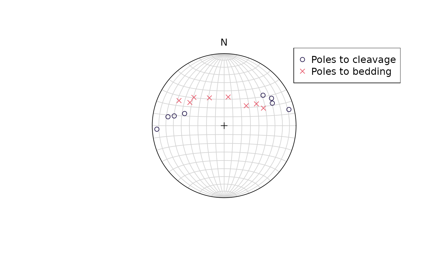 legend("topright", col = c("#1D1147", "#E65164"), pch = c(1, 4), legend = c("Poles to cleavage", "Poles to bedding"))