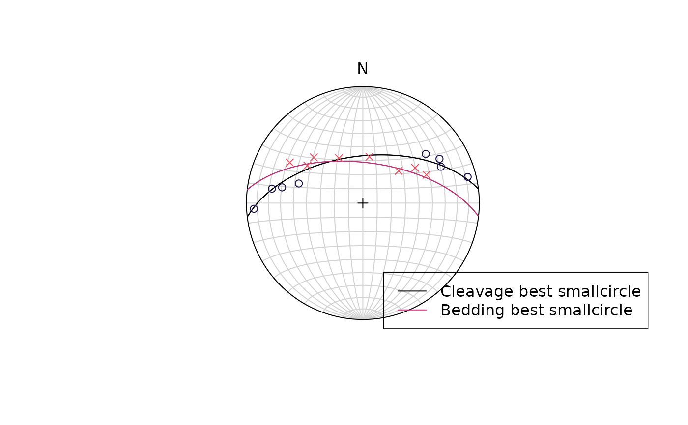 The diagram suggests that both the cleavage and the bedding poles are oriented along great-circles or small-circles. To find out the orientation of these axes and decide whether the orientation better fit a great- or small-circle solution, we’ll perform a (geodesic) regression.