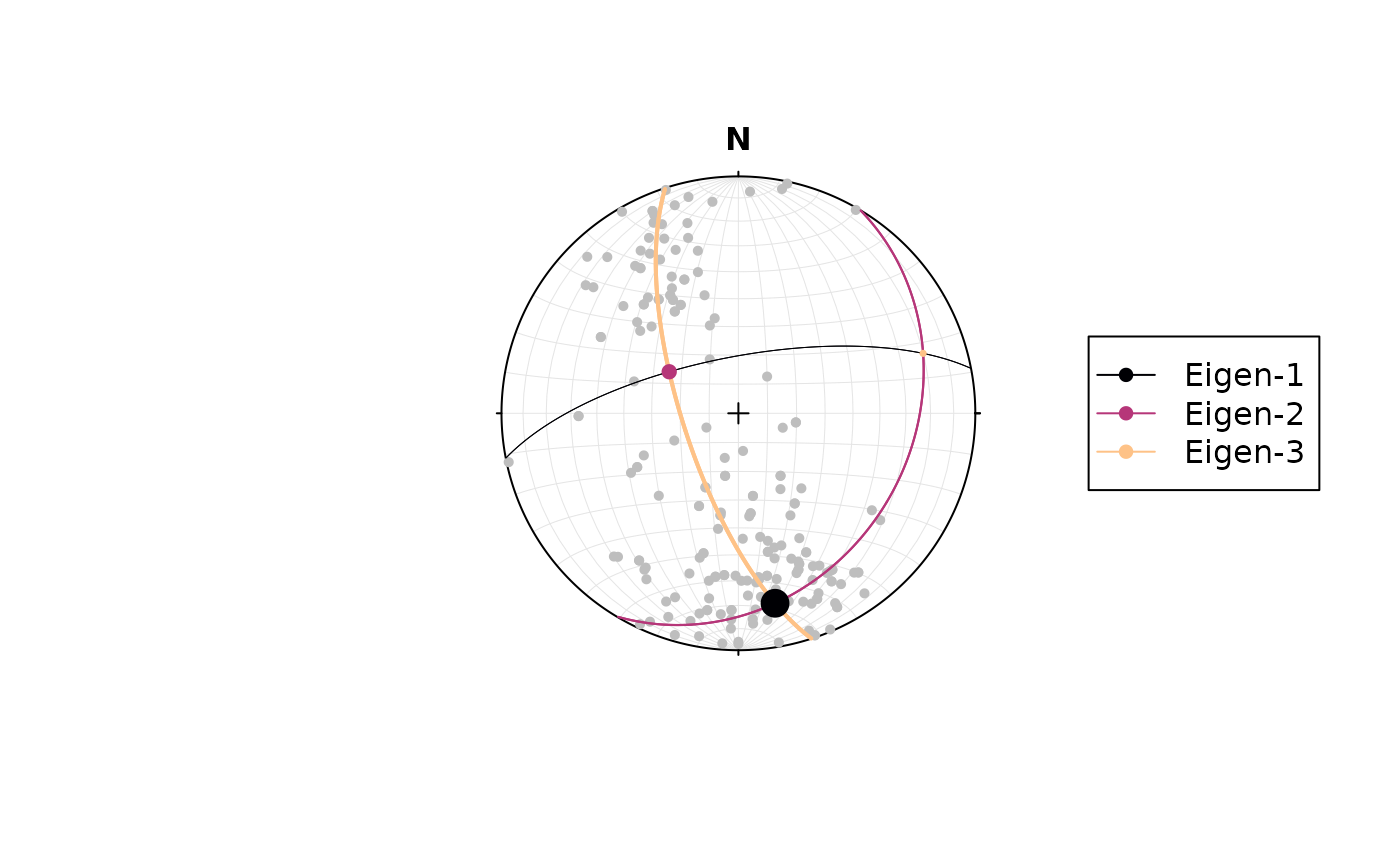 The orientation tensor5 is a matrix comprising the mean direction cosines of the orientation vectors. In case of a Bingham distribution, the Eigenvectors of this tensor describe the orientation of the most dense, intermediate and least dense orientation, and thus, are used to determine the orientation of girdle-distributed vectors (e.g. folded planes).