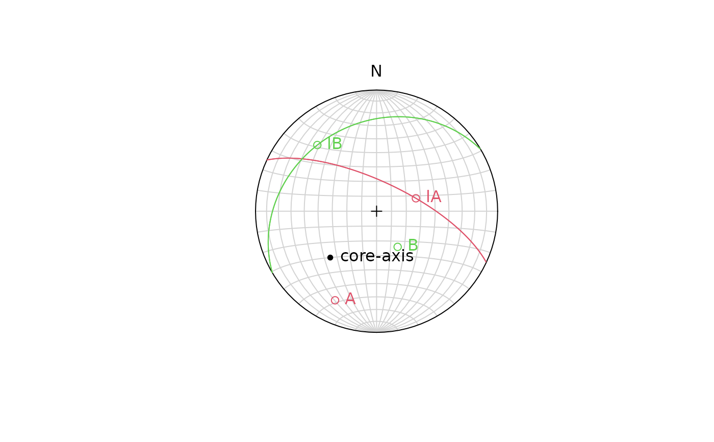 Calculates the orientation of a plane or line from internal core angles (alpha, beta, and gamma) of oriented drill cores