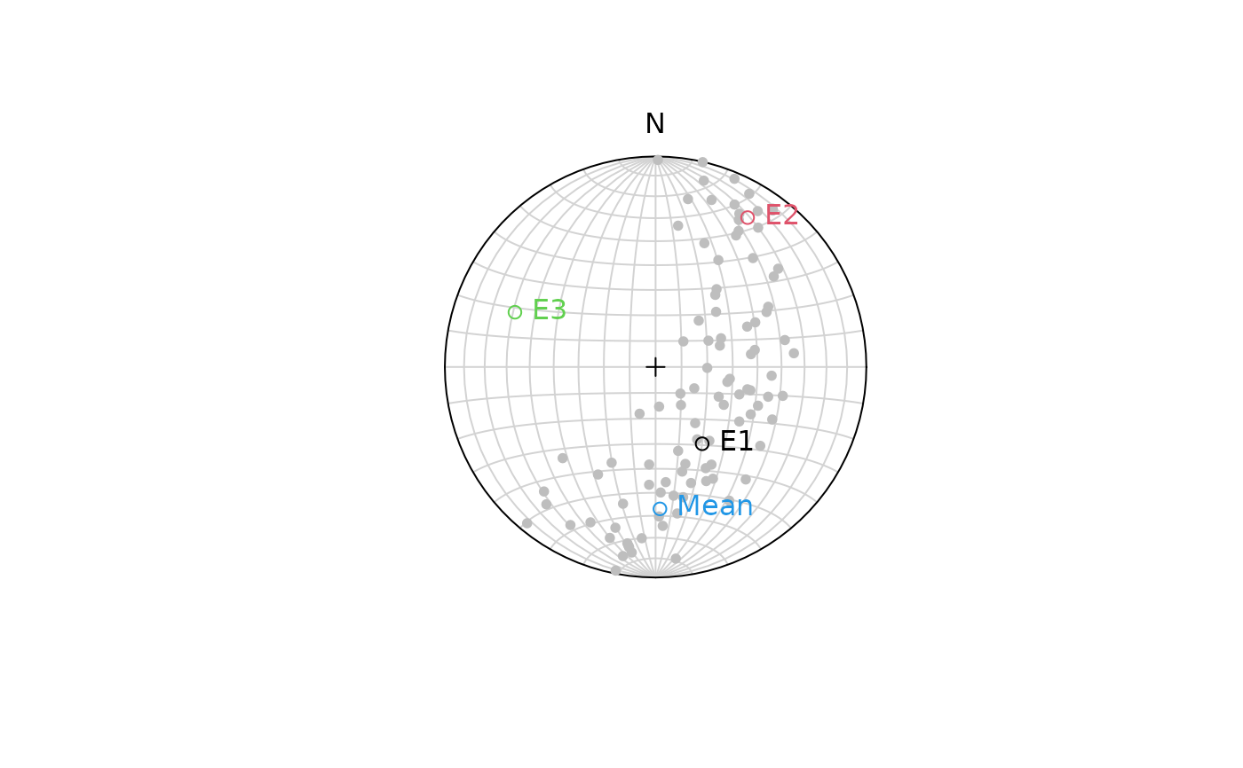 text(x_eigen$vectors, col = c(1, 2, 3), labels = c("E1", "E2", "E3"), pos = 4)