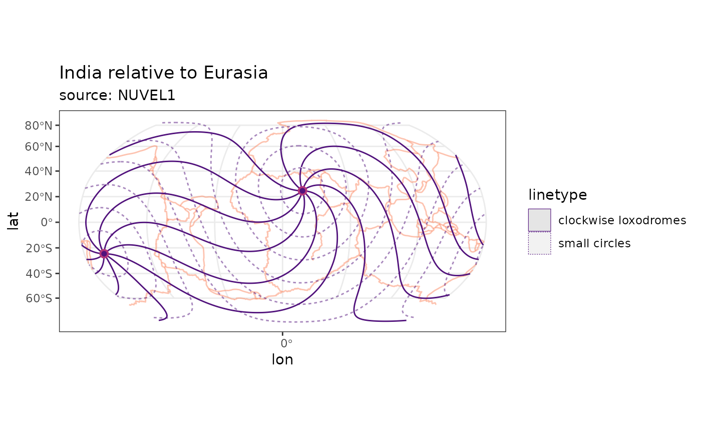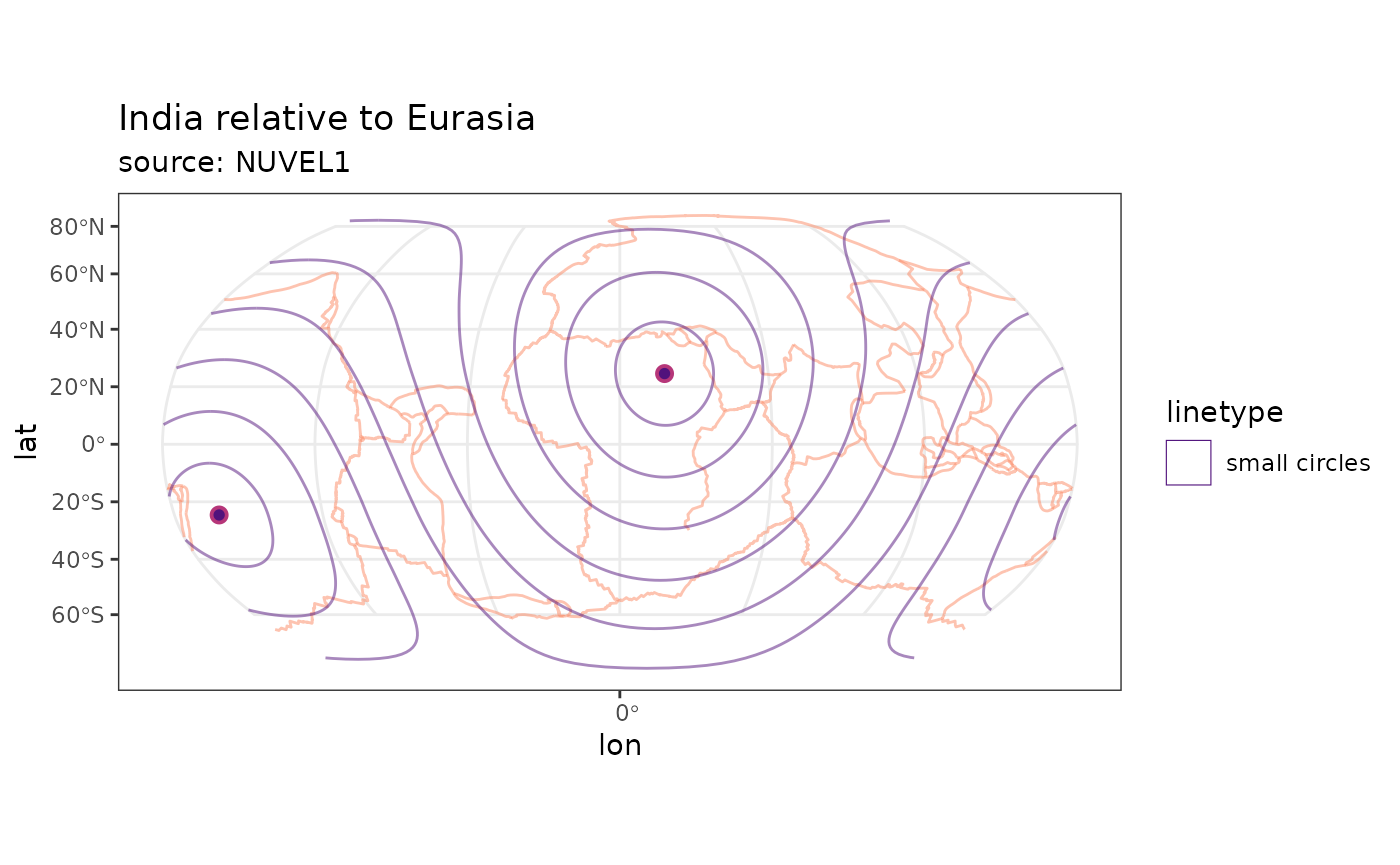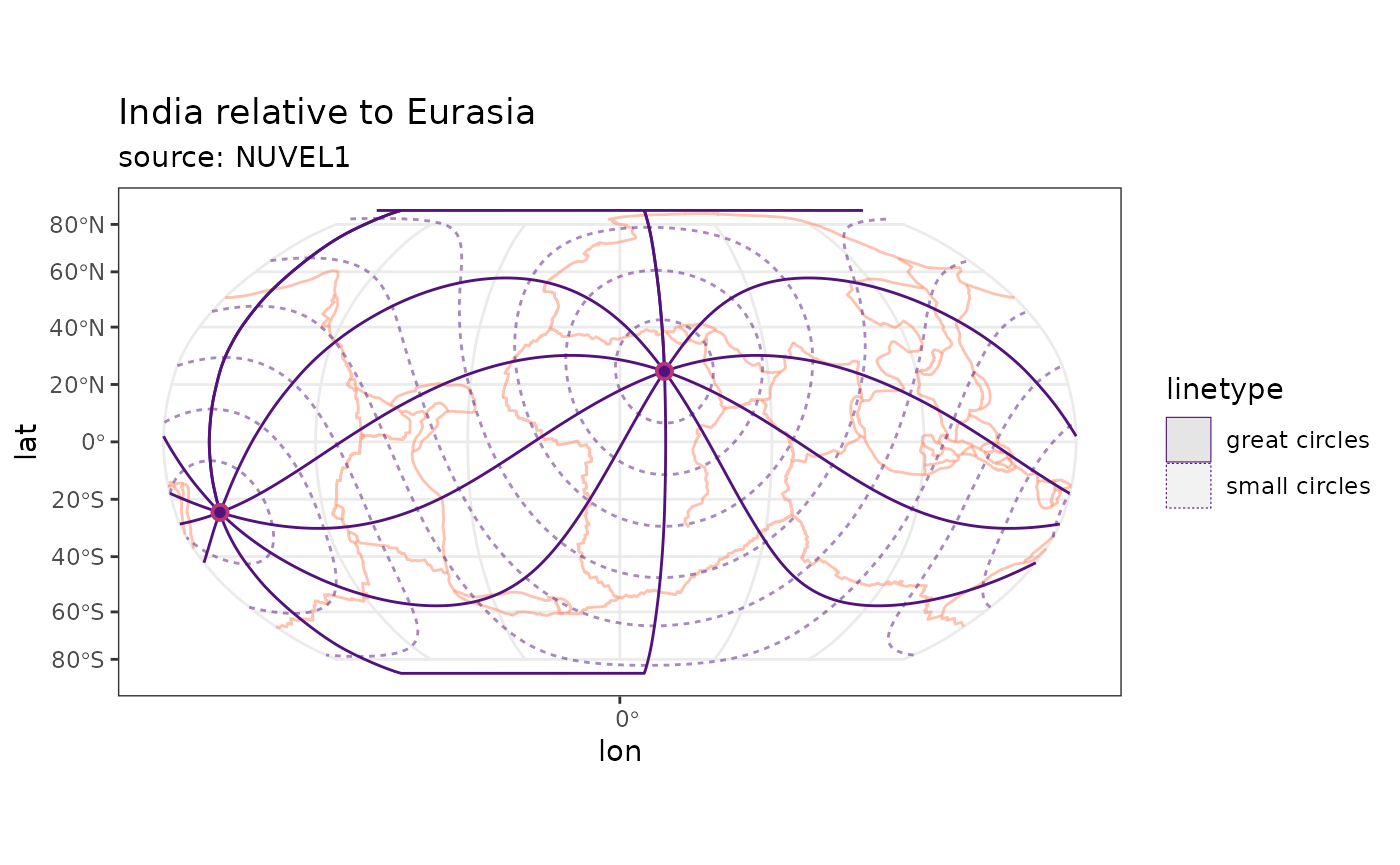 For example the small circles around the pole of the relative motion of the Indian plate relative to the Eurasian plate (transformed from the from the NUVEL1 model).