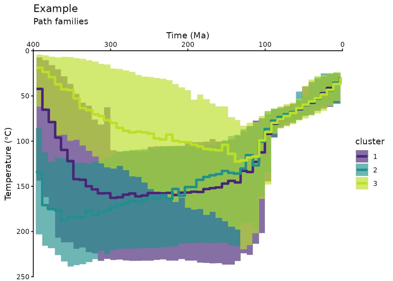 #> # temp_5 <dbl>, temp_95 <dbl>Plot the cluster of the modeled t-T paths: