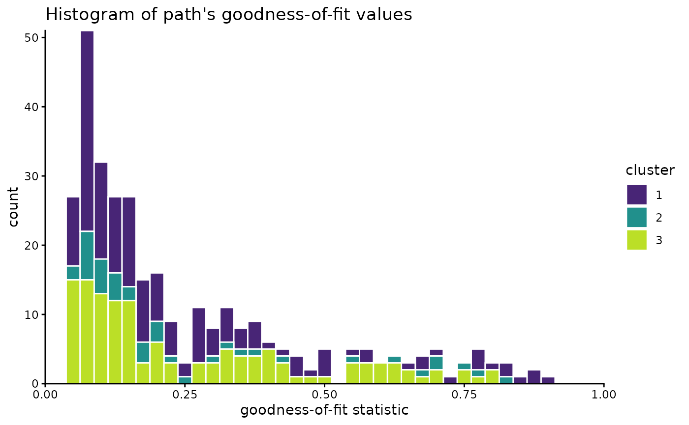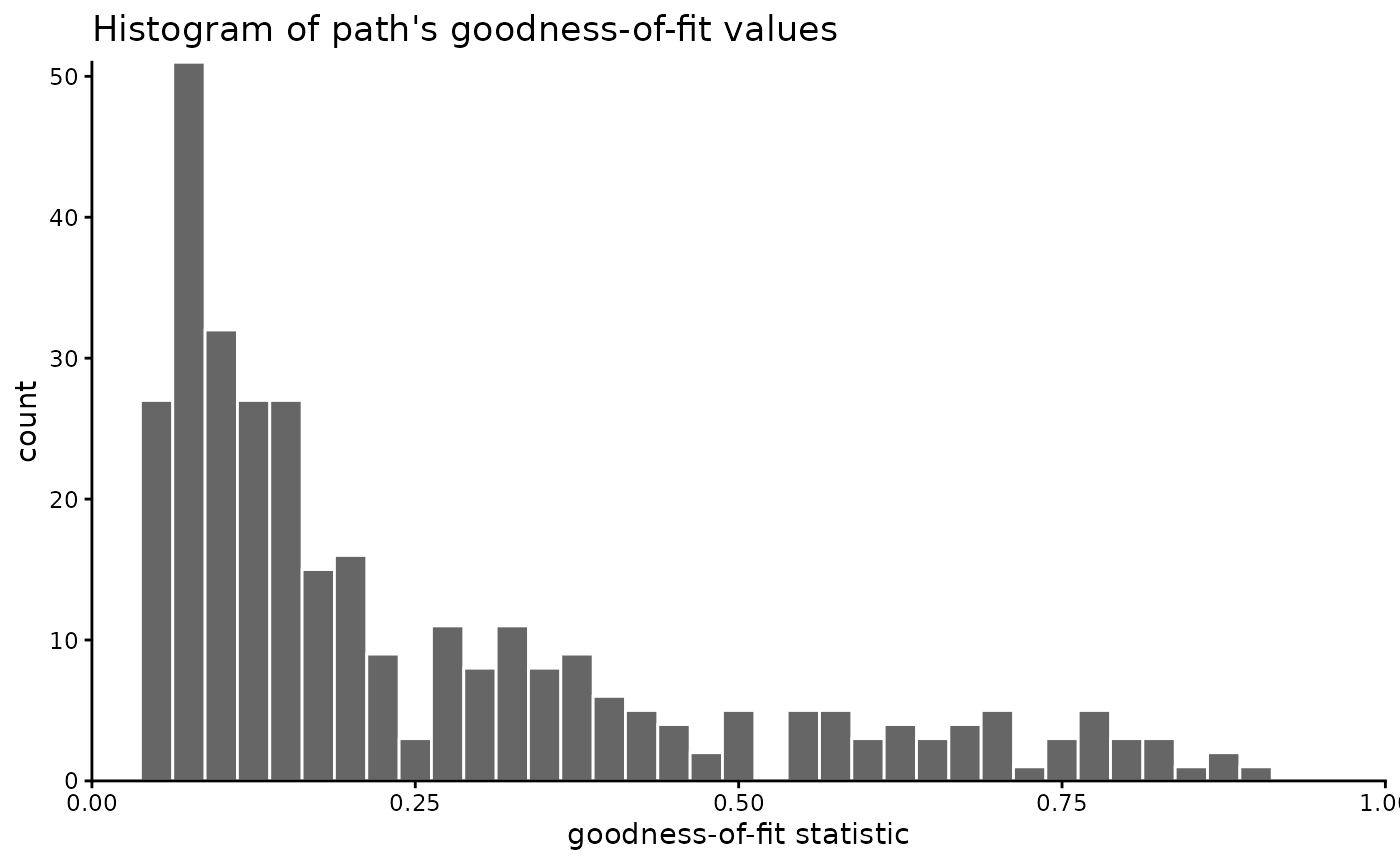 x = "goodness-of-fit statistic", title = "Histogram of path's goodness-of-fit values"