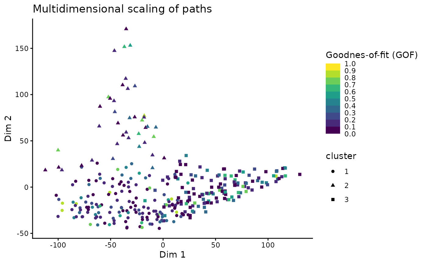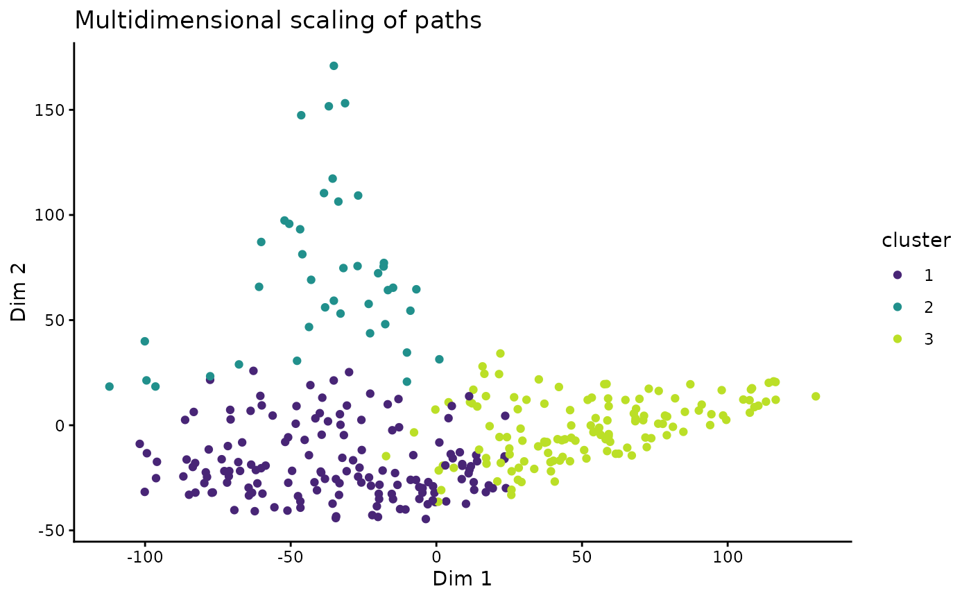 labs(title = "Multidimensional scaling of paths", x = "Dim 1", y = "Dim 2")