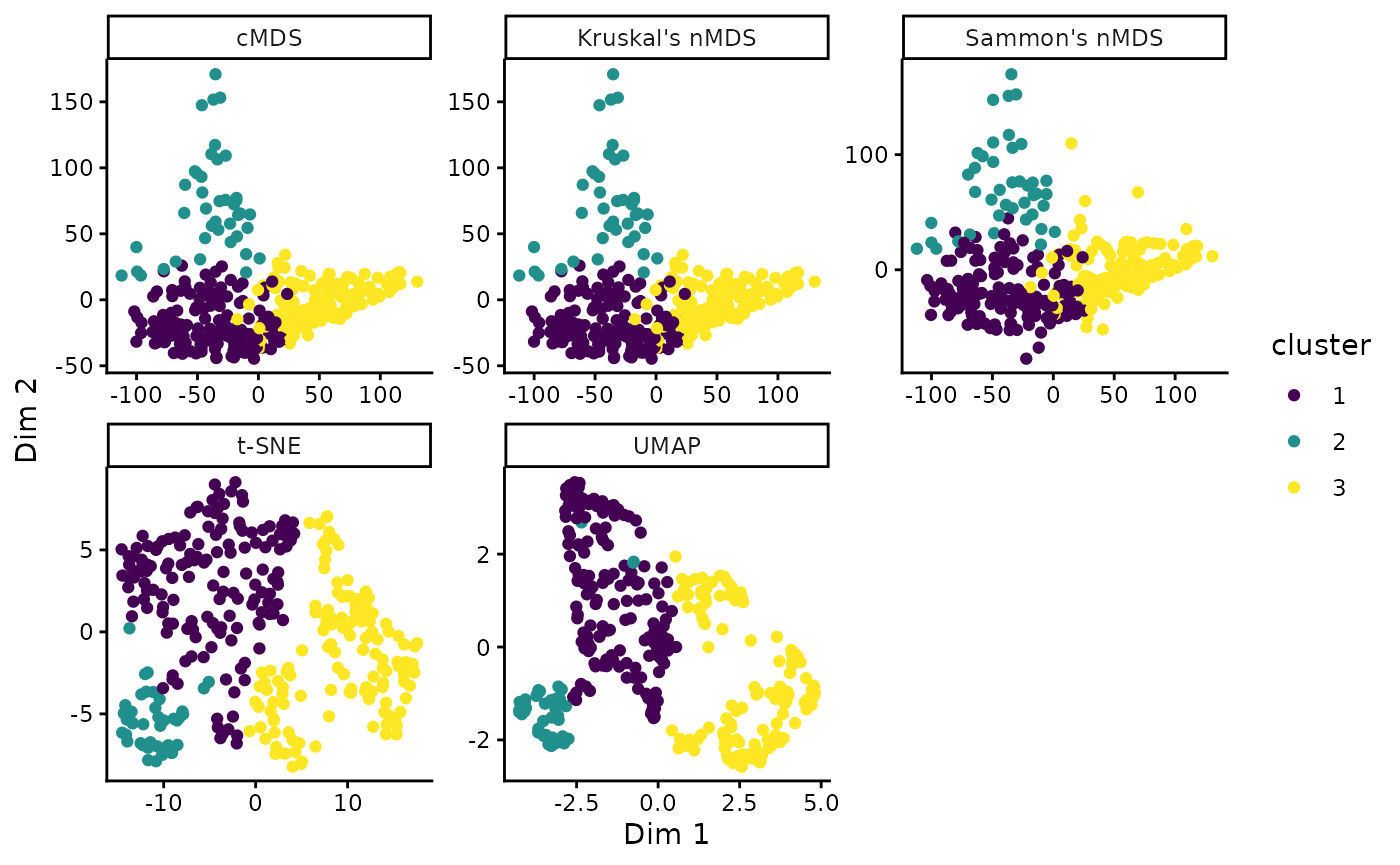 By default, classical metric MDS is used. Alternatively, other methods such as Kruskal’s non-metric MDS, Sammon’s non-metric MDS, Uniform Manifold Approximation and Projection (UMAP), or t-distributed Stochastic Neighbor Embedding (t-SNE) can be used: