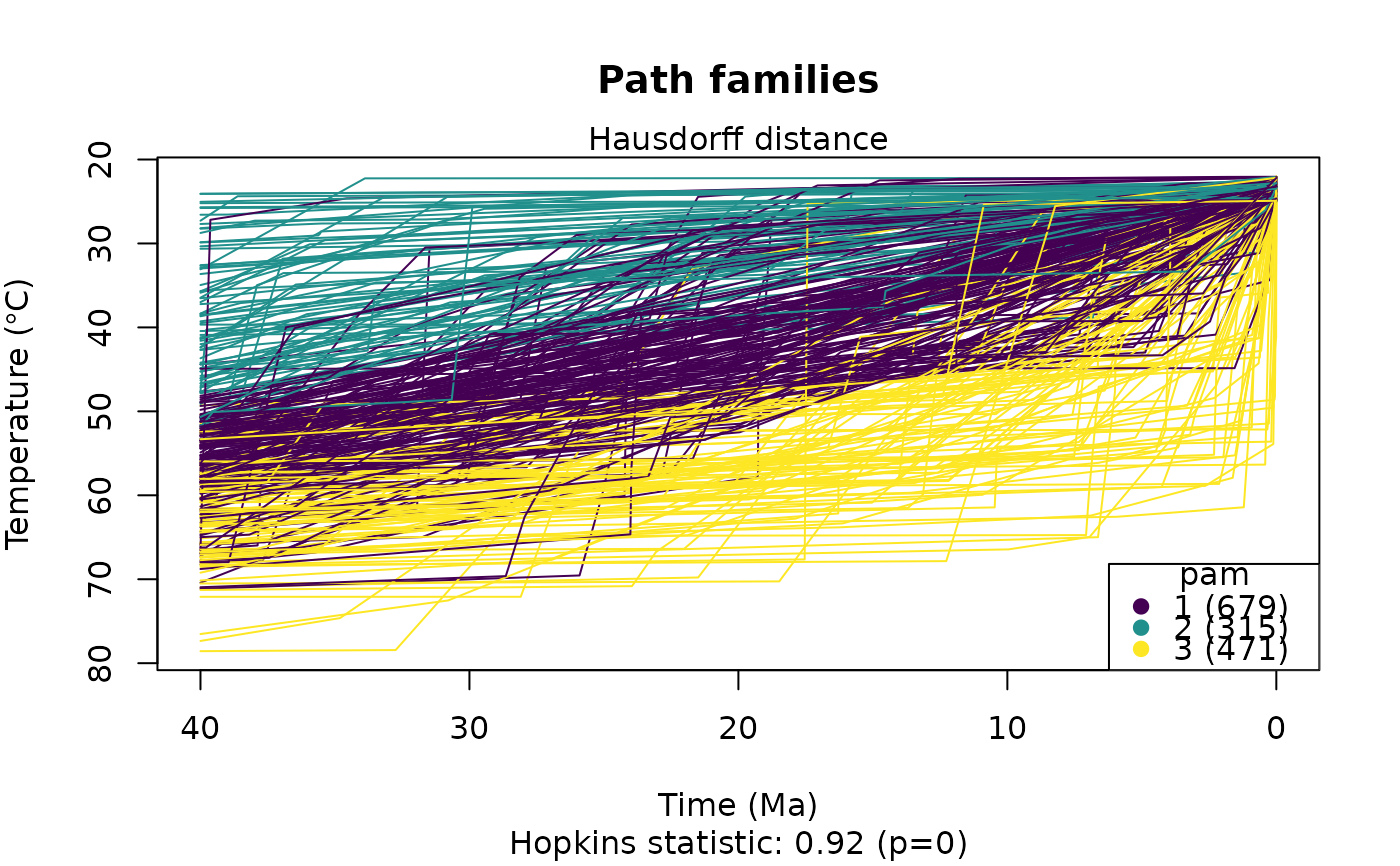 plot_paths(tT_paths, do.cluster = TRUE, cluster.params = list(k = 3, method = "pam"))